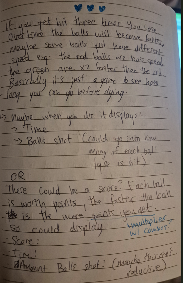 The concept I came up from that was shooting objects(I refer to them as balls in the images) before they reach you or you’ll lose health. From this I expanded what the game could include: