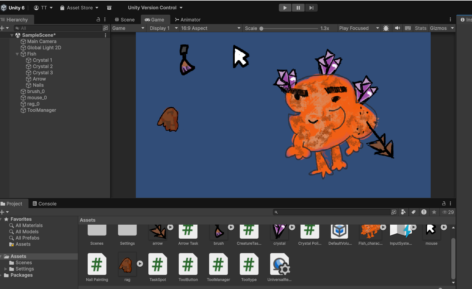 For my prototype I based it off the pet shop game idea, but I wasnt able to do it very well due to my limited coding expierence. The idea was you would be given 3 different tasks you had to perform to make the pet happy. Paint its nails, remove the arrow from its side and polish its crystals. You would have 3 different tools to perform these tasks. I made the assets and tried to implement it into unity but it didnt work well, so next week I will just work based off of the astroid shooter prototype.