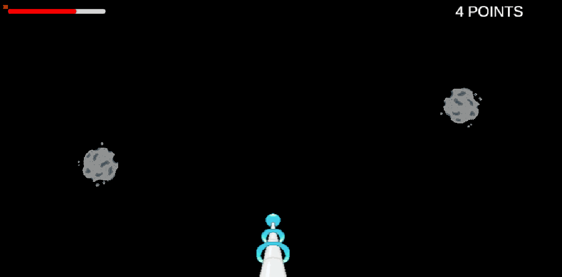 As of right now you lose health when two asteroids collide. It takes 3 hit to down the players, but with two asteroids colliding the damage is actually set at 0.5 so that it equals 1 HP taken away when they collide, I’m not sure how to make so when they collide it’s one account of colliding not two. I also made an explosion animation in aim to highlight when they collide but it’s unused right now.